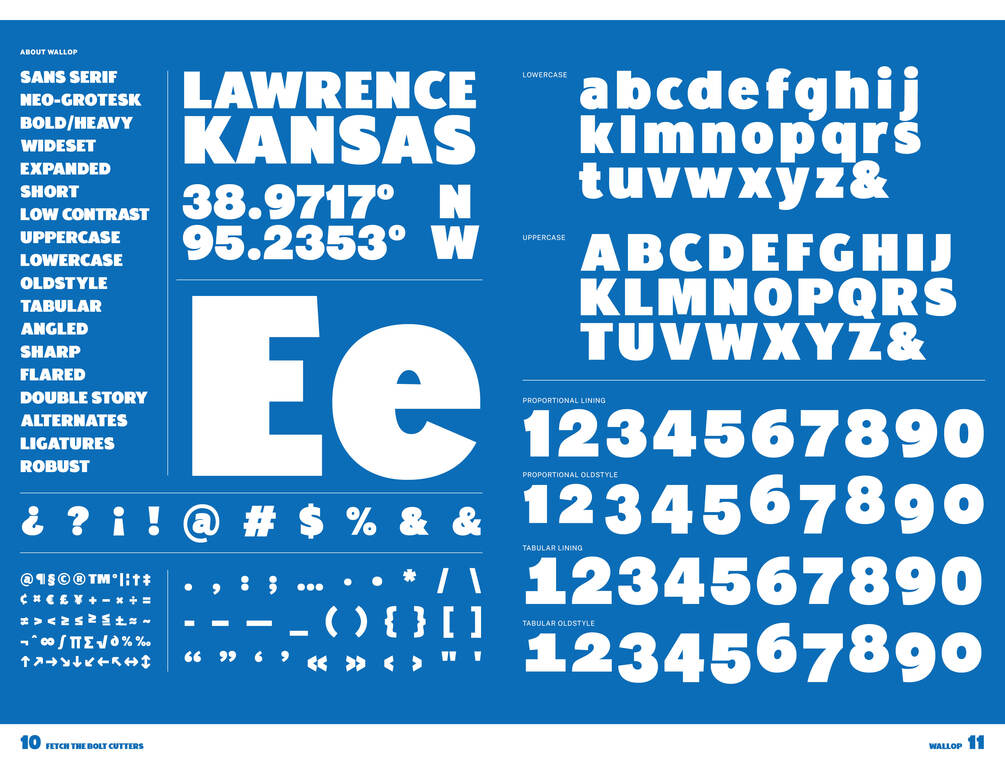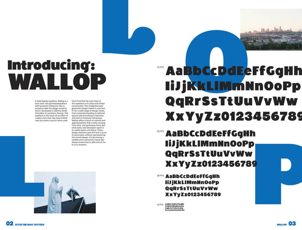 A bold display typeface developed in 2024 by Ethan Schreiber in Lawrence, Kansas. Wallop is a sans serif, neo-grotesque typeface with humanist influences. This typeface is the result of an effort to create a font that may have limited uses but packs a punch when used. Wallop offers a touch of warmth and approachability that is often missing from other neo-grotesque fonts.